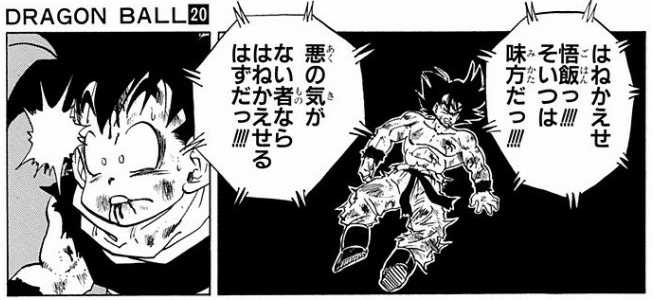 「はねかえせ悟飯!! そいつは味方だ!! 悪の気がない者ならはねかえせるはずだ!!!」